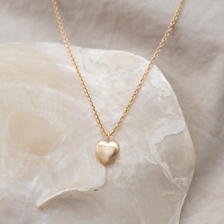 Hjertevedhæng i massivt 14kt guld. Overfladen kan ændres og sten kan tilføjes efter ønske. Vi har også et udvalg af forskellige guldkæder, der kan tilkøbes.