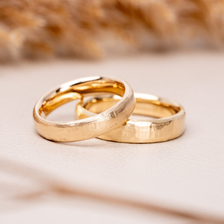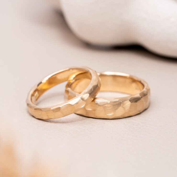 Vielsesringe i 14kt guld med silkemat, groft hammerslået overflade. Når vi laver vielsesringe til jer, så tilpasser vi ringene, så de passer til jer og jeres hænder, derfor vil vi gerne have et uforpligtende designmøde med jer på værkstedet. Prisen på vielsesringene kan derfor variere og denne oplyste pris er vejledende.