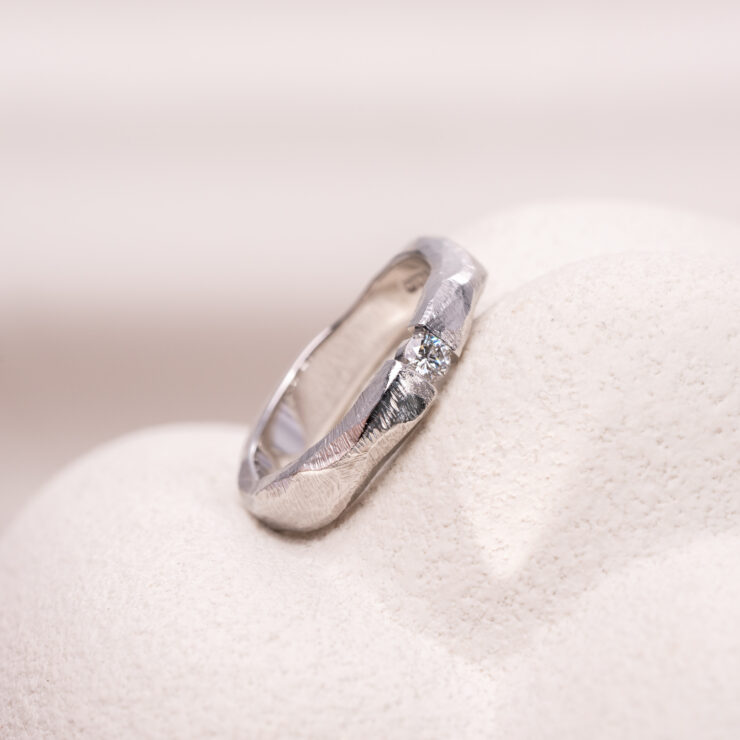 Vielsesringe i 14kt hvidguld med filet overflade og hvid brilliant. Overfladen er håndlavet og jeres ringe vil derfor altid få et helt unikt udtryk. Når vi laver vielsesringe til jer, så tilpasser vi ringene, så de passer til jer og jeres hænder, derfor vil vi gerne have et uforpligtende designmøde med jer på værkstedet. Prisen på vielsesringene kan derfor variere og denne oplyste pris er vejledende.