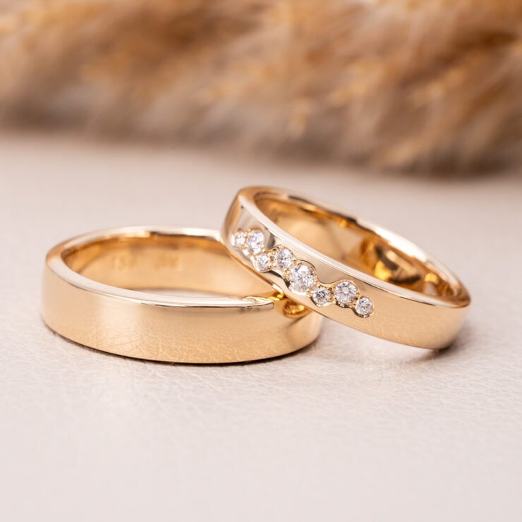 Vielsesringe i 14kt guld med blank overflade og hvide brillianter fattet i fransk pavé. Når vi laver vielsesringe til jer, så tilpasser vi ringene, så de passer til jer og jeres hænder, derfor vil vi gerne have et uforpligtende designmøde med jer på værkstedet. Prisen på vielsesringene kan derfor variere og denne oplyste pris er vejledende.