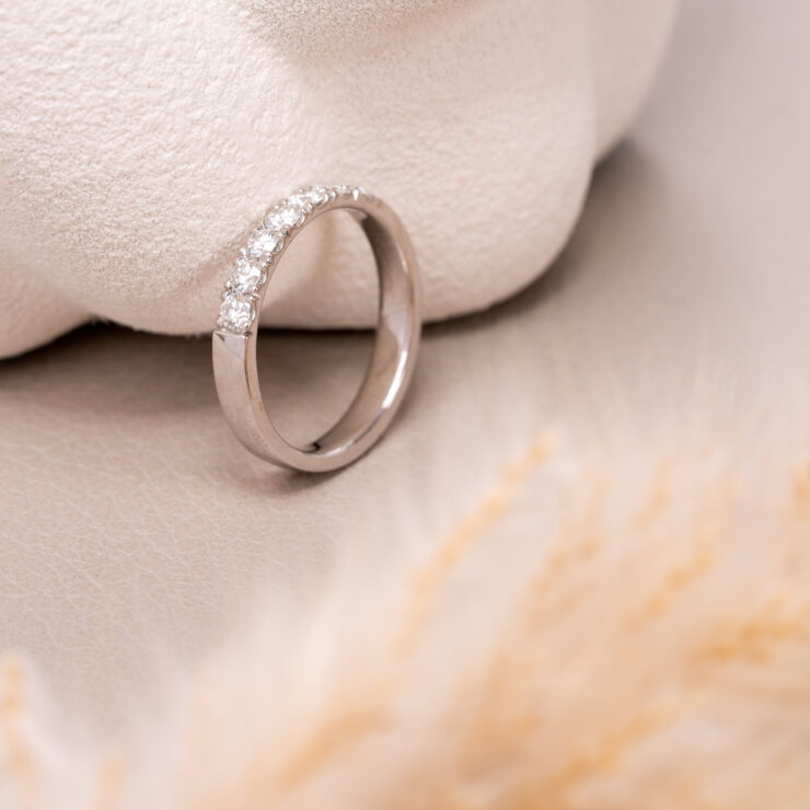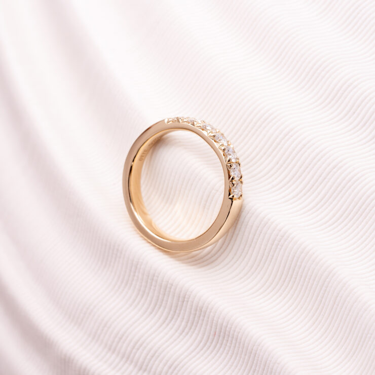 Alliancering i 14kt guld med hvide brillianter fattet i fransk pavé. Der kan altid tilføjes flere sten til allianceringen senere, f.eks. i anledning af årsdage.